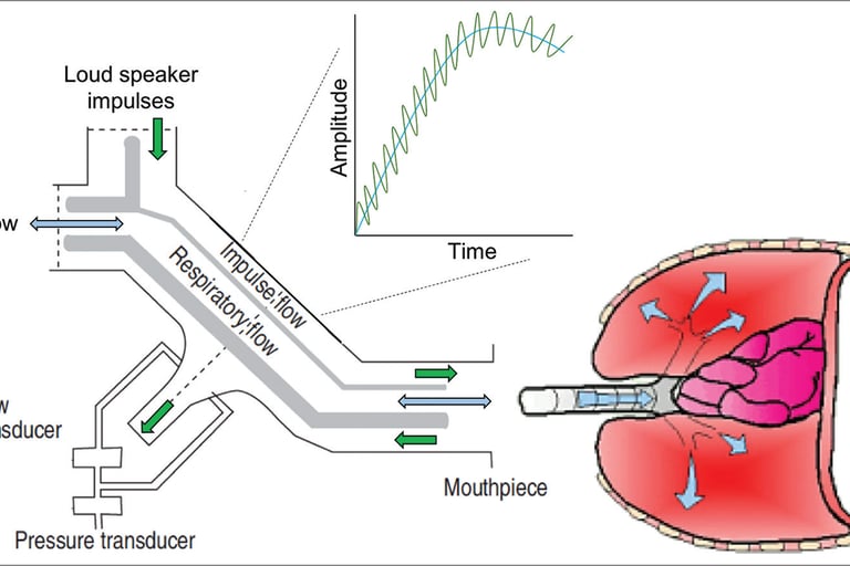 Lung oscillometry is a non-invasive technique used to assess the mechanical properties of the respiratory system, particularly in the airways. It involves applying a low-amplitude oscillating pressure signal to the lungs and measuring the resulting flow and pressure waves. This allows for the assessment of airway resistance, reactance, and compliance, providing insights into lung function that can be helpful in diagnosing and monitoring conditions like asthma and COPD.